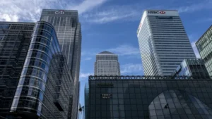 One Canada Square, at the heart of Canary Wharf financial district seen standing between the Citibank building and HSBC building on 14th October 2022 in London, United Kingdom. The U.K. is set to reform many post-2008 banking regulations.